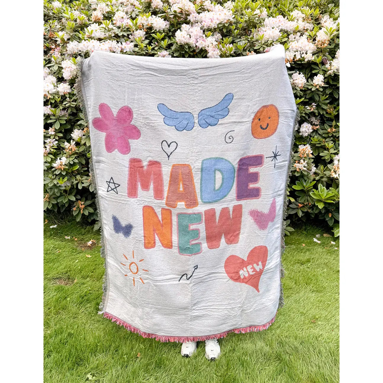 Level up your lounge days with our Made New Throw Blanket. With its unique message woven into the design, this throw will keep you cozy and comforted while journaling or slowing down this season.