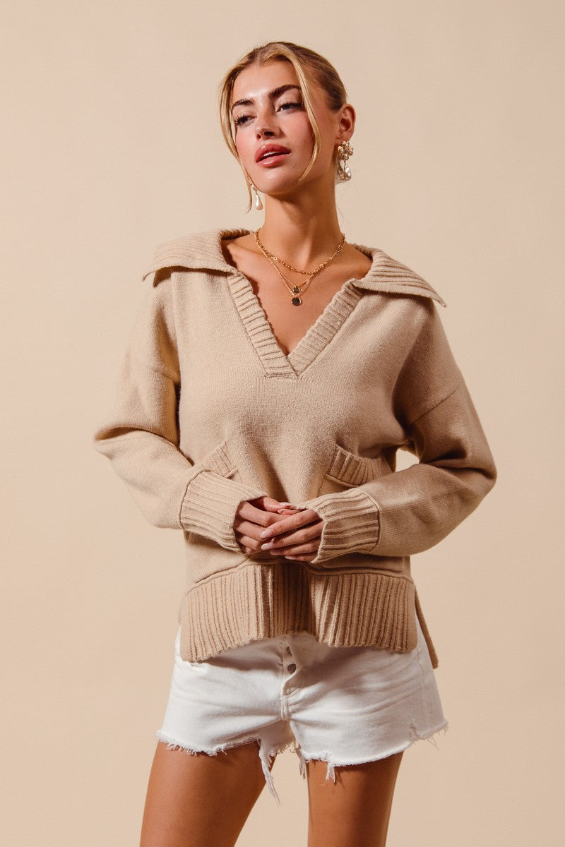 Oatmeal Flap Collar Sweater Pullover Top With Patch Pocket