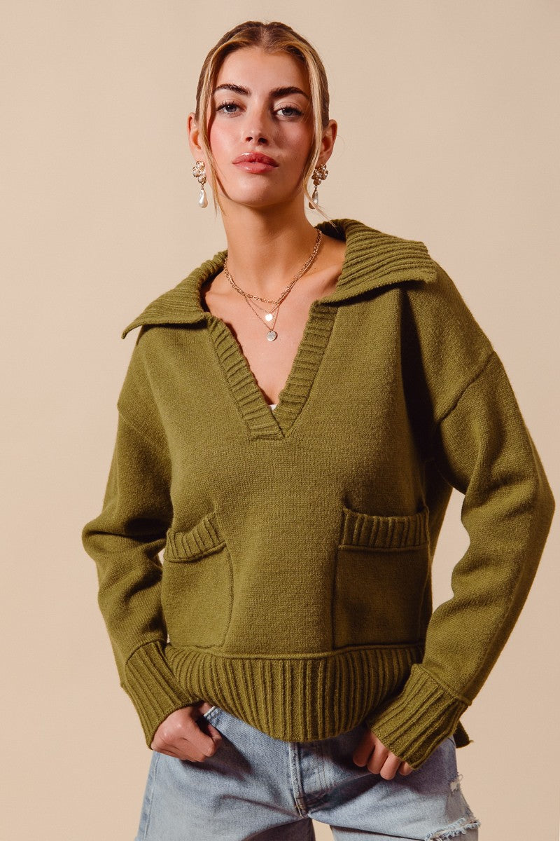 Light Olive Flap Collar Sweater Pullover Top With Patch Pocket