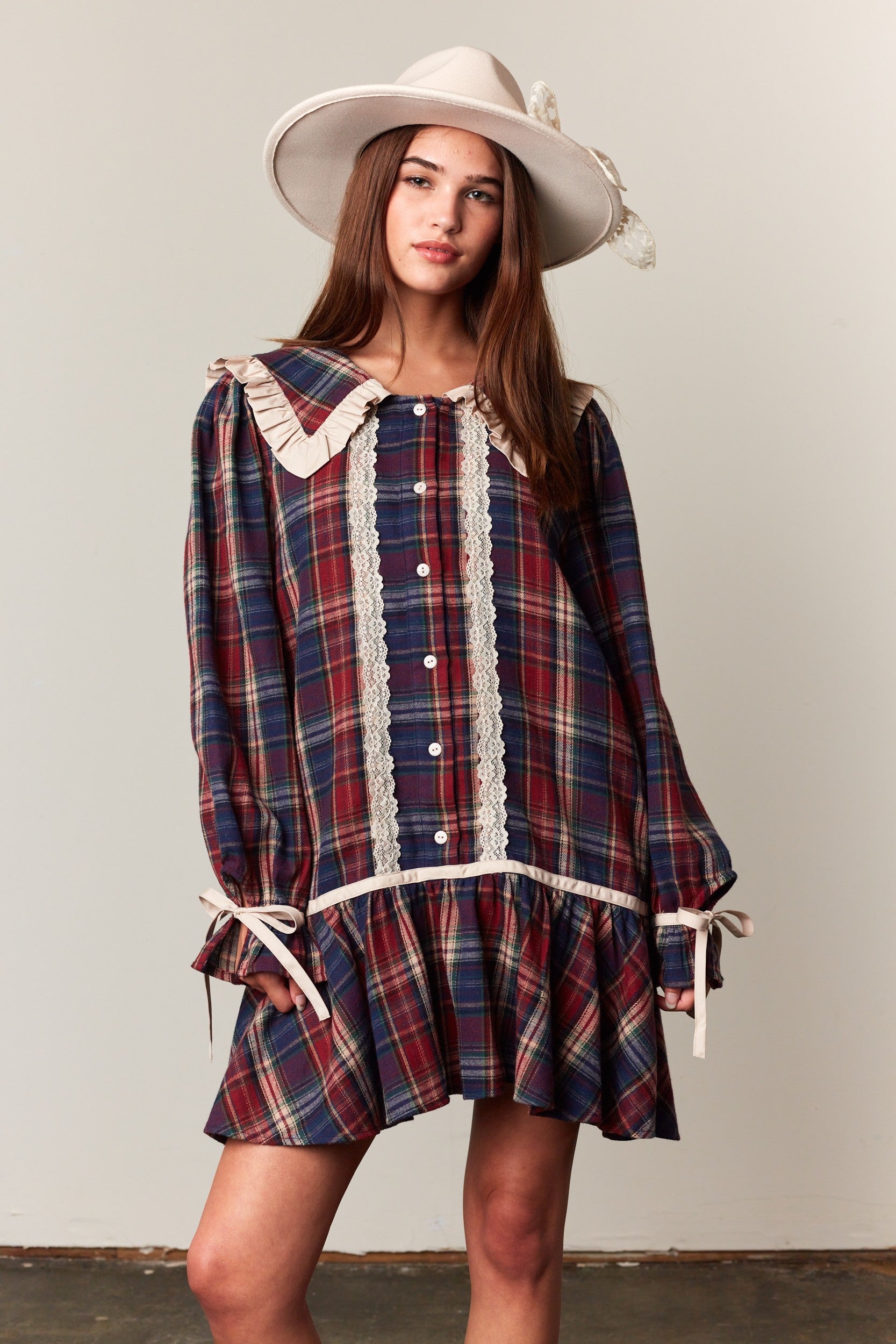 - Relaxed mini dress with a drop-waist silhouette - Classic plaid print in deep red, navy, and green - Button-down front with delicate lace trim detailing - Oversized pointed collar with ruffle edges for a feminine finish - Long sleeves with tie cuffs at the wrists - Ruffle hem adds playful volume and movement