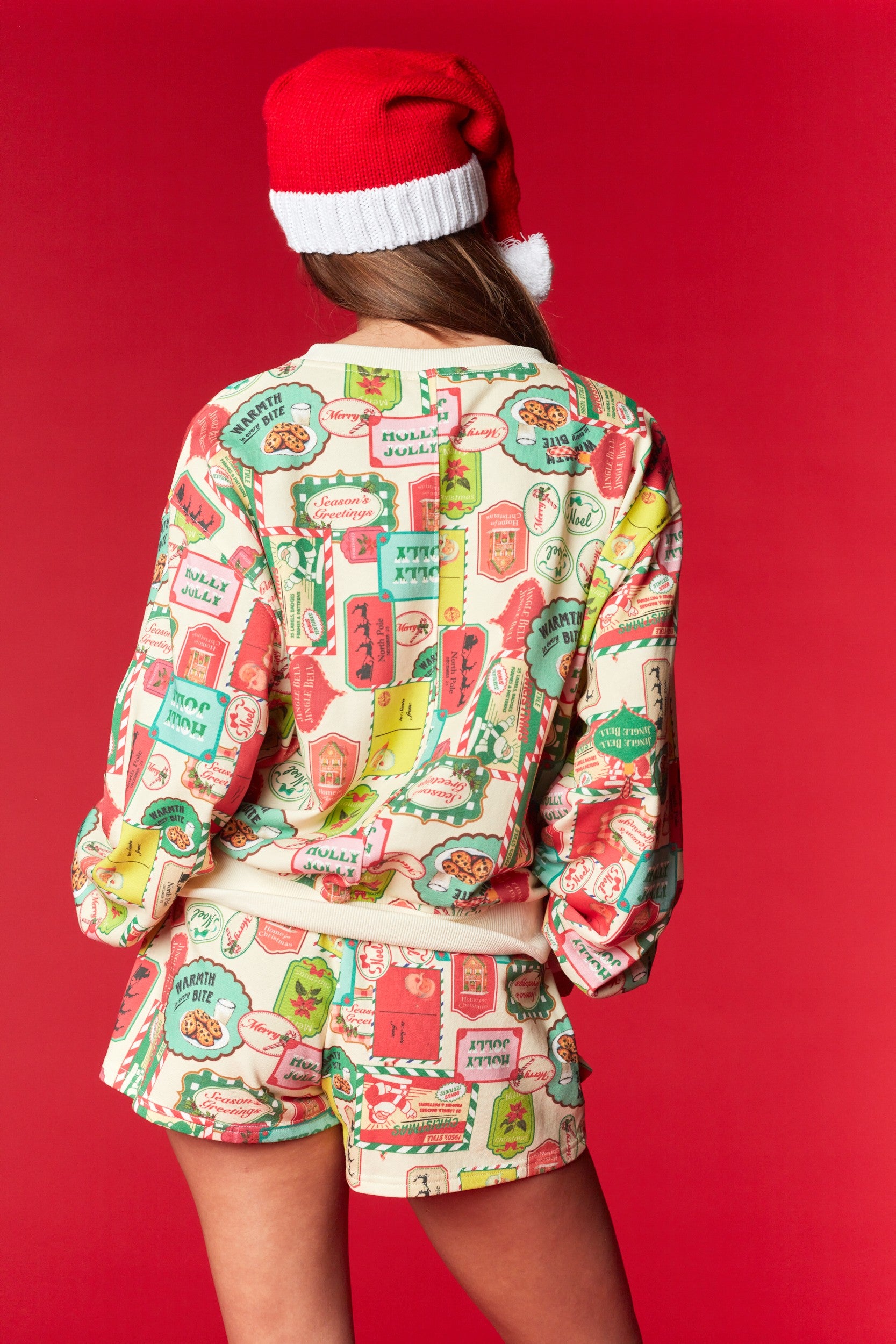 - Two-piece matching set (top and shorts) - Relaxed fit sweatshirt with long sleeves and ribbed cuffs/hem - Elastic waistband shorts with a comfortable fit - Soft cotton-blend fleece - All-over retro Christmas postcard and label print in multicolor - Ribbed trim in contrast red - Playful holiday look with vibrant vintage-inspired graphics